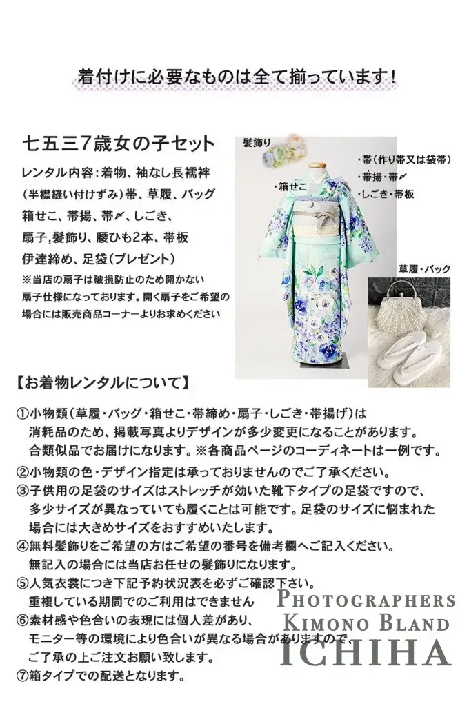 七五三7歳女の子レンタル15点フルセット!着付けに必要なものは全て揃っています!